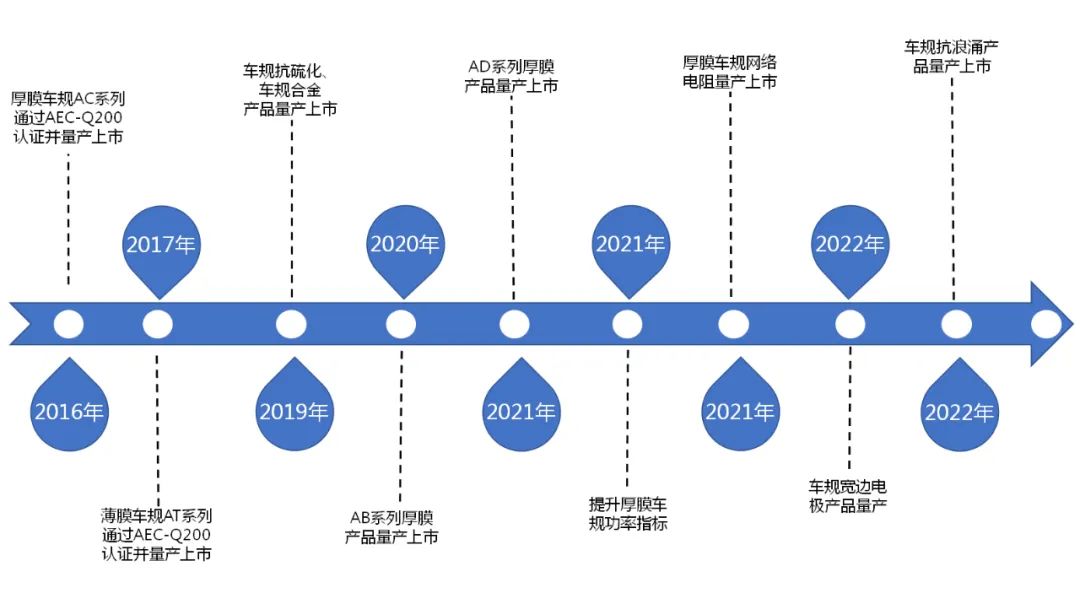 近年來,公司持續(xù)拓展汽車電子市場規(guī)模,用技術創(chuàng)新賦能汽車產業(yè),從汽車電子客戶產品設計前端導入,形成厚膜、合金、薄膜三大技術平臺,產品技術成熟穩(wěn)定,在高功率、高精度、高壓、耐高溫、高阻值等性能方面處于國內領先水平。公司于2016年建成國內第一條車規(guī)電阻生產線,目前,公司車規(guī)系列電阻產品齊全,全線產品均已通過 AECQ-200測試,并與國內多家汽車電子、動力電池配套廠家客戶建立了戰(zhàn)略合作關系。
