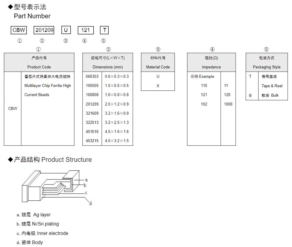 風華高科疊層片式鐵氧體大電流磁珠(CBW)命名規(guī)則: