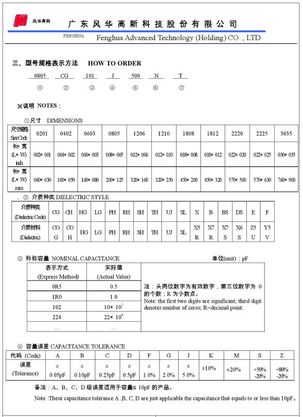 偏差:B=±0.1pF、C=±0.25pF、D=±0.5pF、F=±1%、G=±2%、J=±5%、K=±10%、M=±20%、Z=-20%+80%