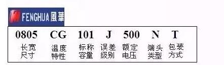 如圖所示:風(fēng)華貼片電容型號(hào)0805 CG 101 J 500 N T