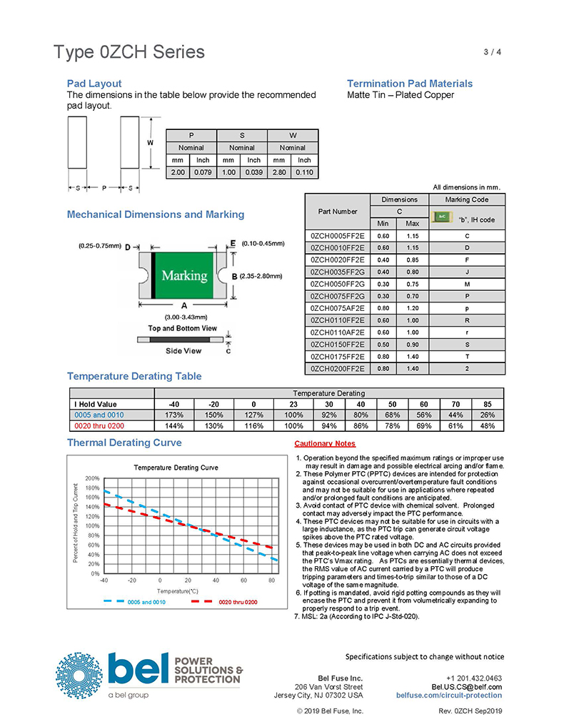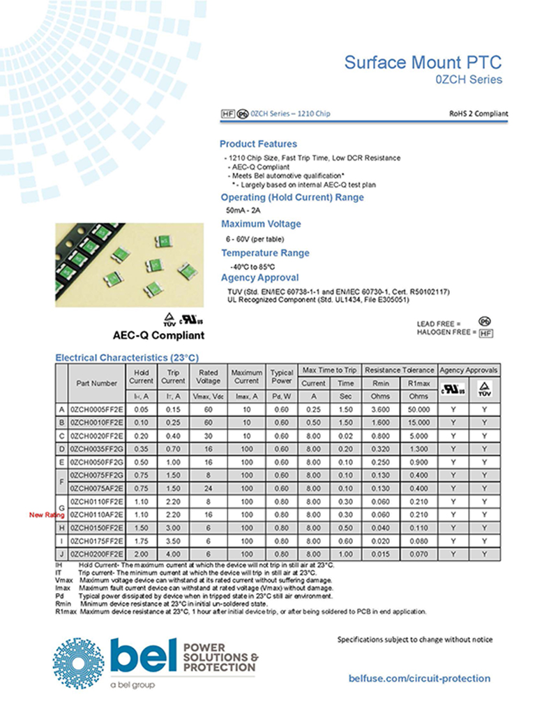 1、額定電壓范圍–6–60 VDC    2、I HOLD Amp范圍–50mA至3A    3、外殼尺寸0603至2920   4、紅外處理-JEDEC J-Std-020–260C,40秒,最長。 5、安全機構批準——UL、TUV6、工作溫度:-40°C至+85°C