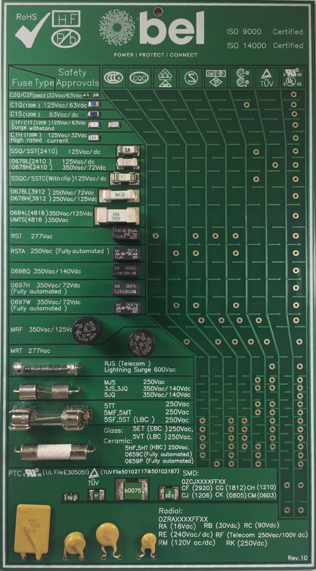 Bel Fuse-Circuit Protection 提供廣泛的 PCB 安裝、表面貼裝和 PTC 自恢復(fù)保險絲。PCB 安裝產(chǎn)品包括徑向、標準玻璃和陶瓷管狀保險絲。該公司已經(jīng)走在行業(yè)向表面貼裝保險絲設(shè)計(諸如磚式和片式保險絲)轉(zhuǎn)型升級的前沿,解決了人們對小而緊湊的技術(shù)的需求。Bel Fuse-Circuit Protection 還提供完整的 PTC 自恢復(fù)保險絲產(chǎn)品線,同時具有表面貼裝和徑向封裝選擇。這些保險絲產(chǎn)品有許多第三方機構(gòu)按照各種各樣的性能標準進行了認證。認證標志授權(quán)機構(gòu)如 UL、CSA、PSE、CCC、VDE 和 Semko。這些保險絲和 PTC 自恢復(fù)產(chǎn)品全部符合 RoHS 2 規(guī)范
