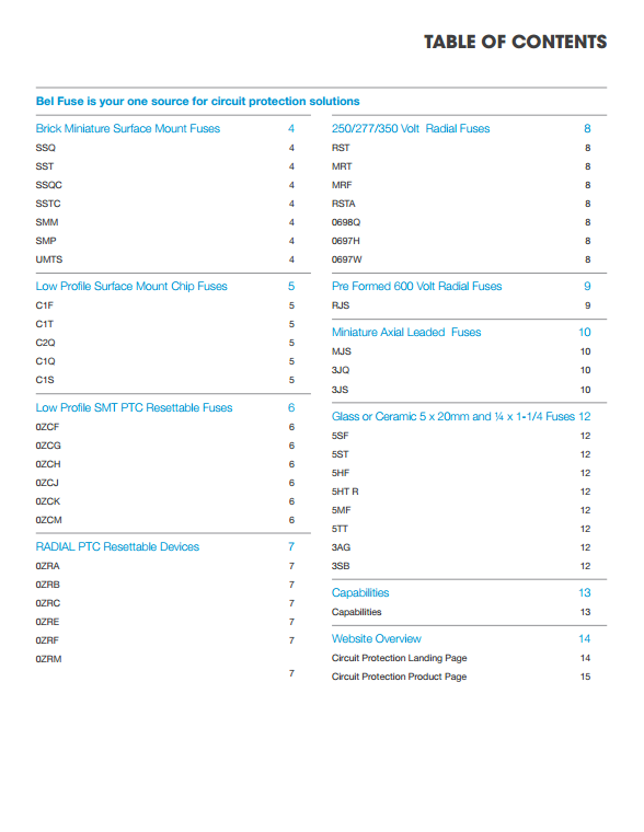 1、磚微型表面貼裝保險絲    2、薄型表面貼裝芯片保險絲    3、薄型SMD可復(fù)位器件    4、徑向PTC自恢復(fù)設(shè)備  5、250/277/350伏徑向保險絲    6、預(yù)制600V徑向保險絲    7、微型軸向引線保險絲   8、玻璃和陶瓷保險絲