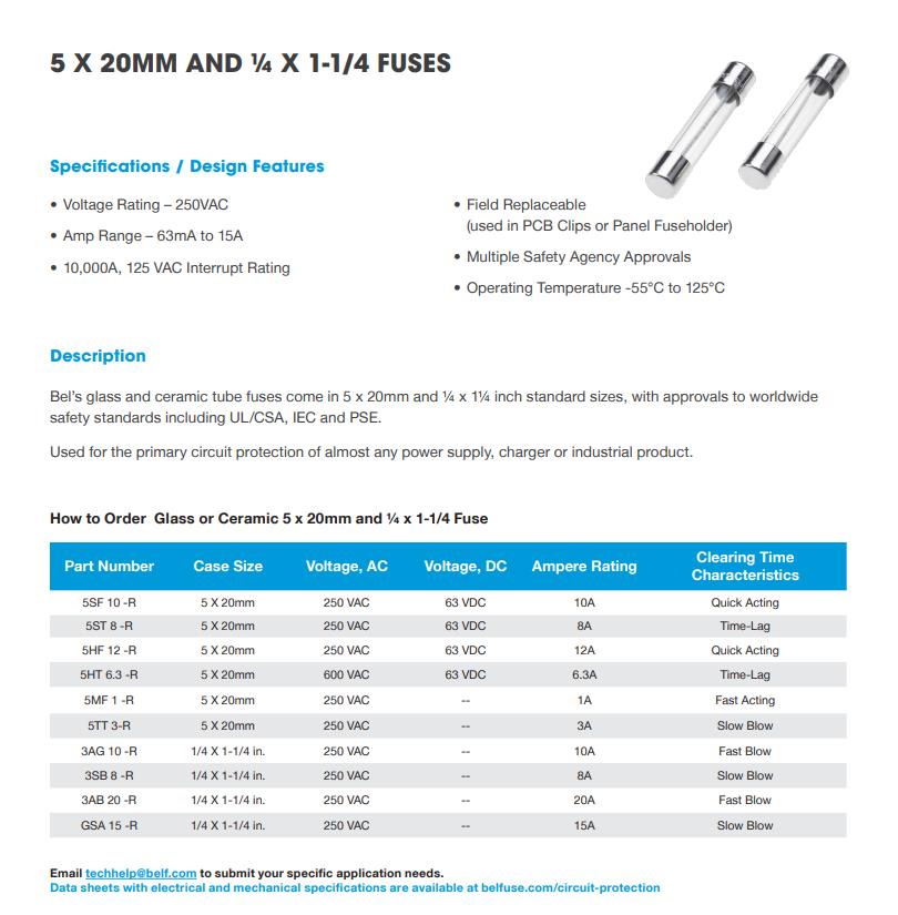BEL的玻璃和陶瓷管保險絲有5 x 20毫米,?x 1英寸標準尺寸,批準在全球范圍內